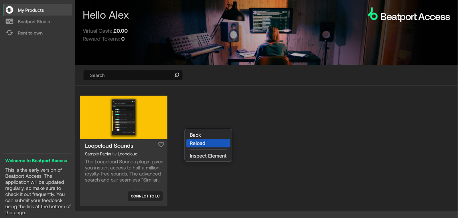 At this point, you can close the Plugin Boutique website, and head back to Beatport Access, where the Loopcloud Sounds product tile will show a 'Download' button instead of the 'Connect to LC' button. If you’re not seeing 'Download' at this stage, just right-click and 'Reload 'the app. This should force the button to update.