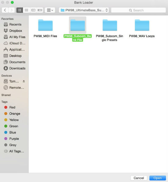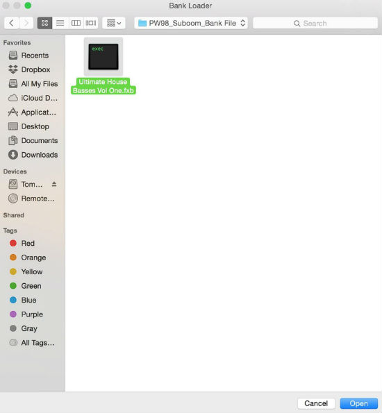 4. Double-click on the 'PW98_Suboom_Bank File' sub-folder, and select the 'Ultimate House Basses Vol One.fxb' file > once the file is selected, click on the 'Open' or 'Choose' option that is displayed within your computer's web browser to upload the bank file.