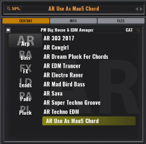 6. To browse the presets, simply click on the 'Content' tab of Avenger's browser and select the 'House & EDM Avenger (A)' icon > you will then be able to browse the presets that are available in the displayed list.