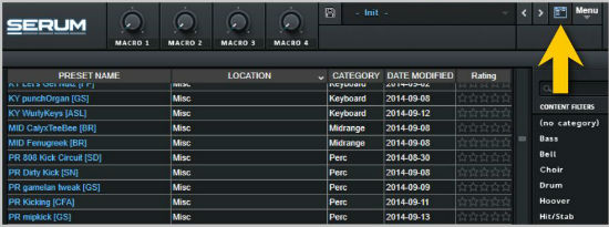 4. Once Serum has been reloaded, click the ‘Browser’ folder icon/tab (as highlighted by the yellow arrow below) on the left side of the ‘Menu’ tab and you will then see your presets in the list (as shown below). Double-click your preferred preset to load it into Serum.