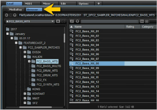 2. Open Halion within your DAW and navigate to the ‘Browser’ tab, which will display your computer’s file system. Locate your purchased sample pack from the computer destination that you saved it to, and select the desired patch within the Halion ‘Sampler Patches’ folder.