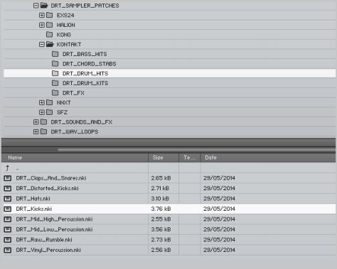 3. Locate the main Kontakt sub-folder within the ‘Sampler Patches’ folder you can locate and select the patch that you wish to use via the lower window tab (as shown in the image above e.g ‘DRT_Kicks.nki’).