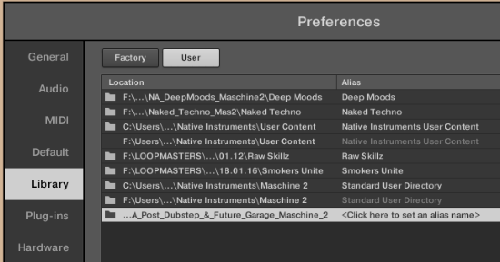 2. To do this, go to Maschine’s ‘Preferences’ area before selecting the ‘Library’, and then ‘User’ tabs.