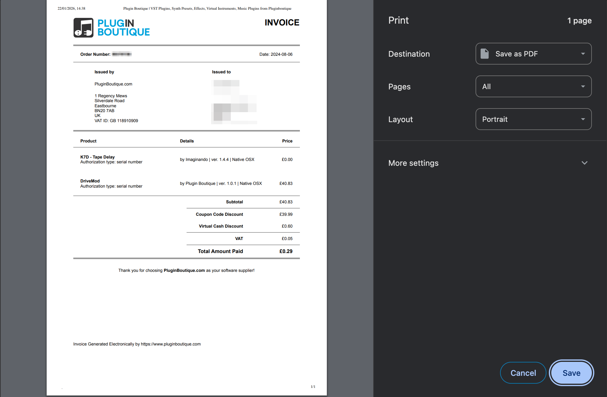5. You will now be able to view your order invoice as a PDF within your browser. There, you will be able to print or save this document.