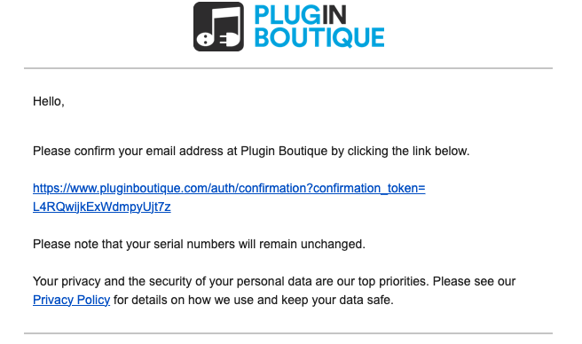 Unfortunately, our confirmation emails can sometimes be mistaken as spam by email providers. If this happens, please check your Junk/Spam folders in your account for an email from info@pluginboutique.com that looks like this...
